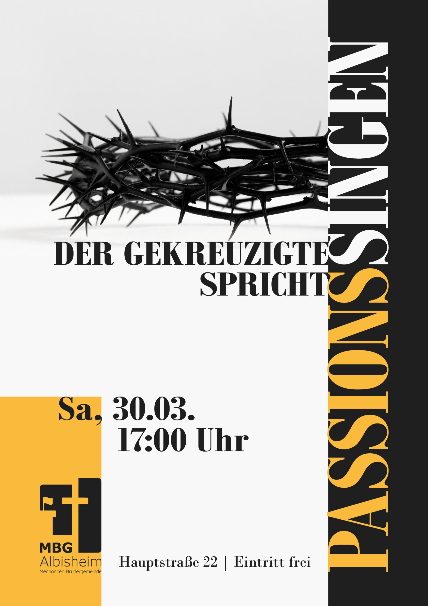 Wir laden Sie herzlich zum Passionssingen ein! Es handelt sich um ein Konzert zu Karfreitag und Ostern. Es erwarten Sie Passionslieder und die Passionsgeschichte sowie eine Ansprache.